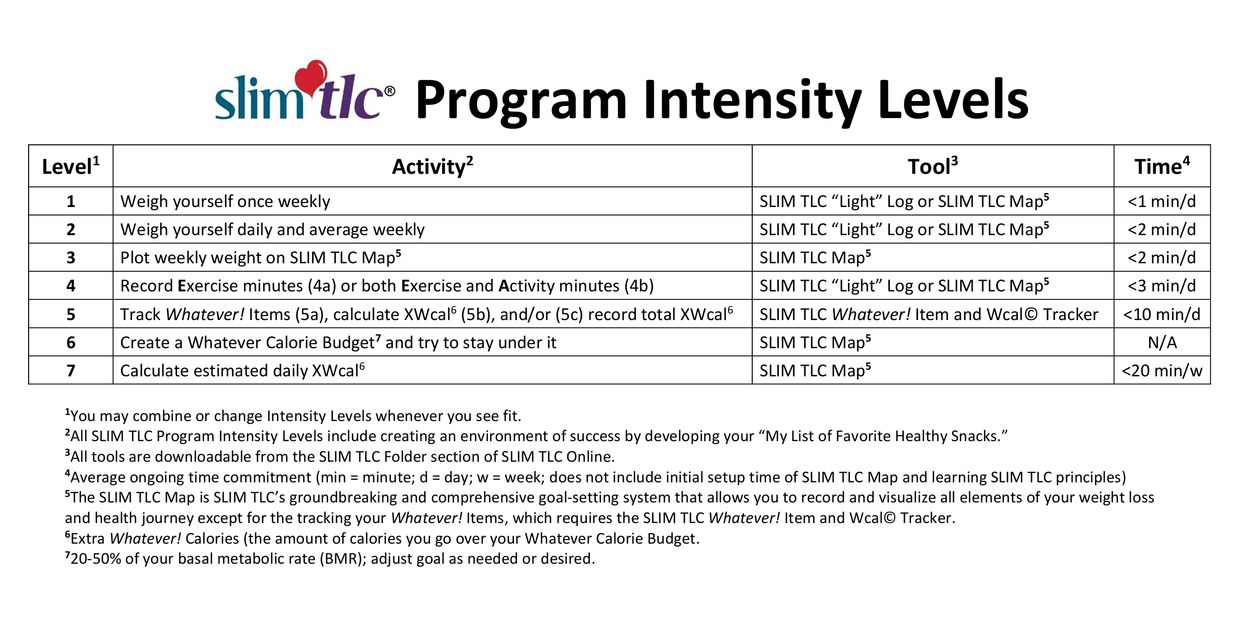 Simply weighing yourself once weekly and recording it on the SLIM TLC “Light” Log or SLIM TLC Map (Level 1) may be all you need to achieve success, of course combined with striving to create an environment of success. Combining the rest of the Levels (2-7), which includes completing all components of the SLIM TLC Map, will require the up-front learning time described below (and requires the greatest ongoing time commitment), but it will also be the most effective – and yet it may only be needed initially, until you “learn the ropes.” The good news is that you can combine any Levels you desire and go up or down in Level intensity (= commitment) whenever your needs and desires change! However, we discourage you from ever stopping all Levels completely – consider at least continuing Level 3 for life. Recording your progress is a way of being accountable to yourself – but to increase the power of accountability, we also recommend sharing your Log or Map once monthly with one or two people you know and trust, thus increasing your likelihood of success. Those people can be us if you have joined the formal SLIM TLC program.
